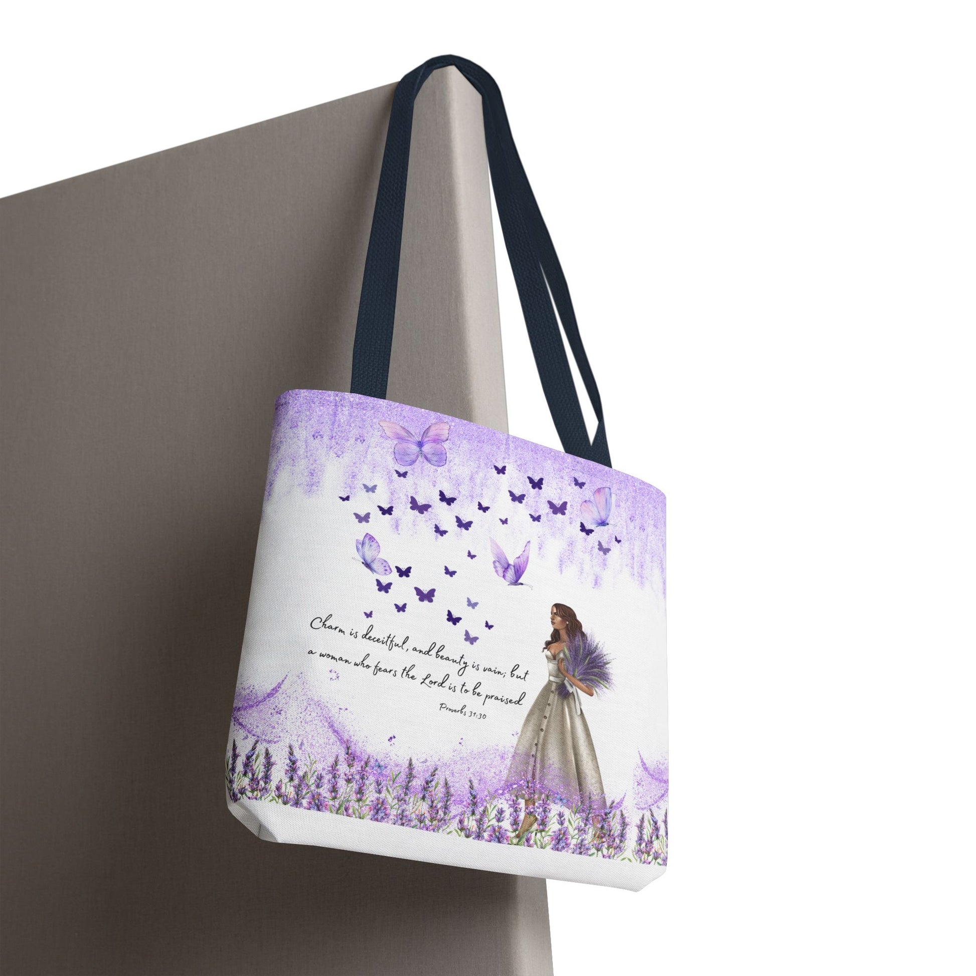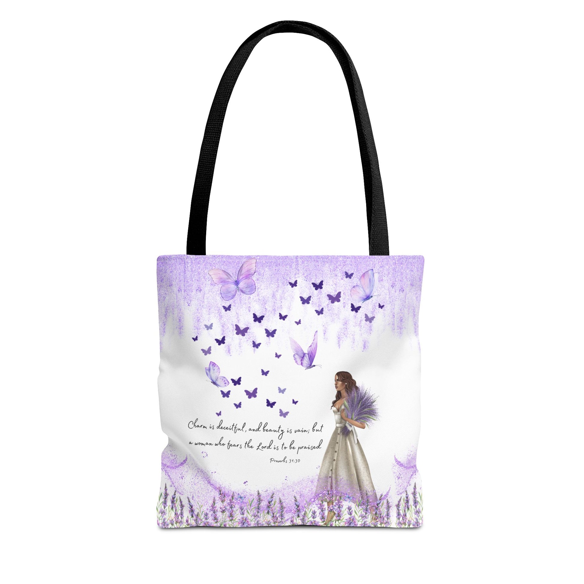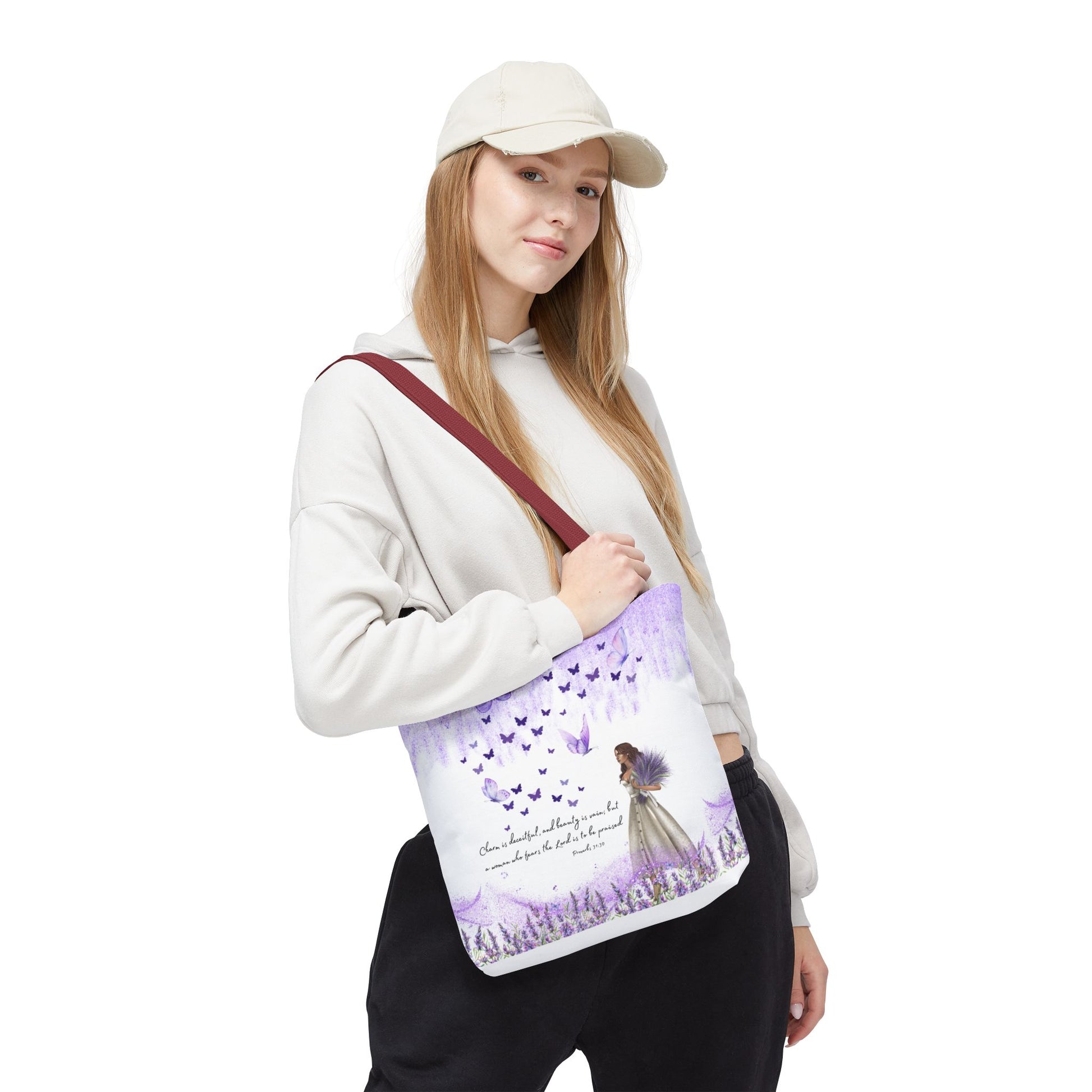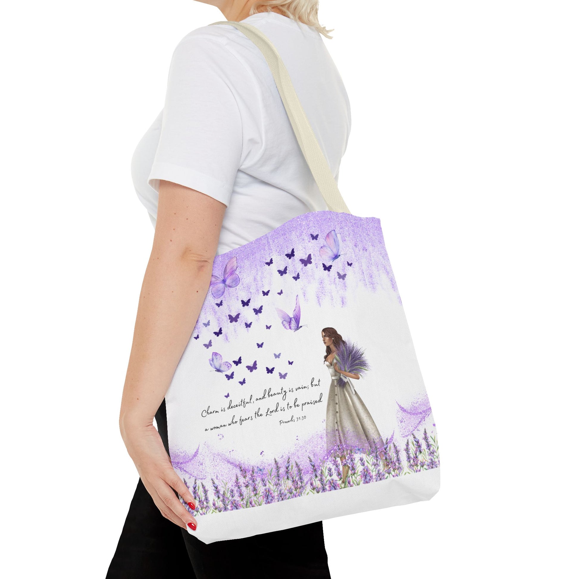 A Proverbs 31 tote bag perfect for everyday use, made with durable 100% polyester fabric. This tote bag features reinforced stitching on handles, boxed corners for extra space, and comes in 5 color handle options. Ideal for those looking for a stylish and practical tote bag for carrying essentials, relevant for religious celebrations and everyday use.