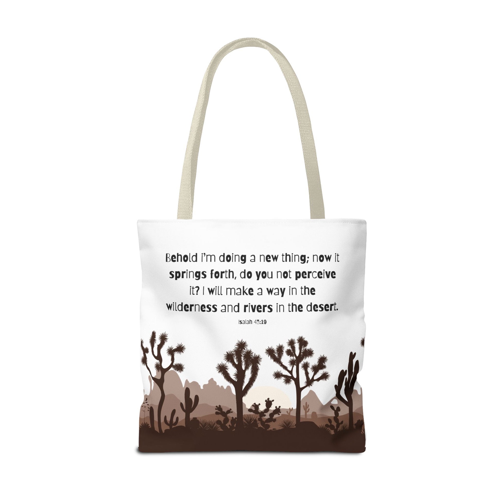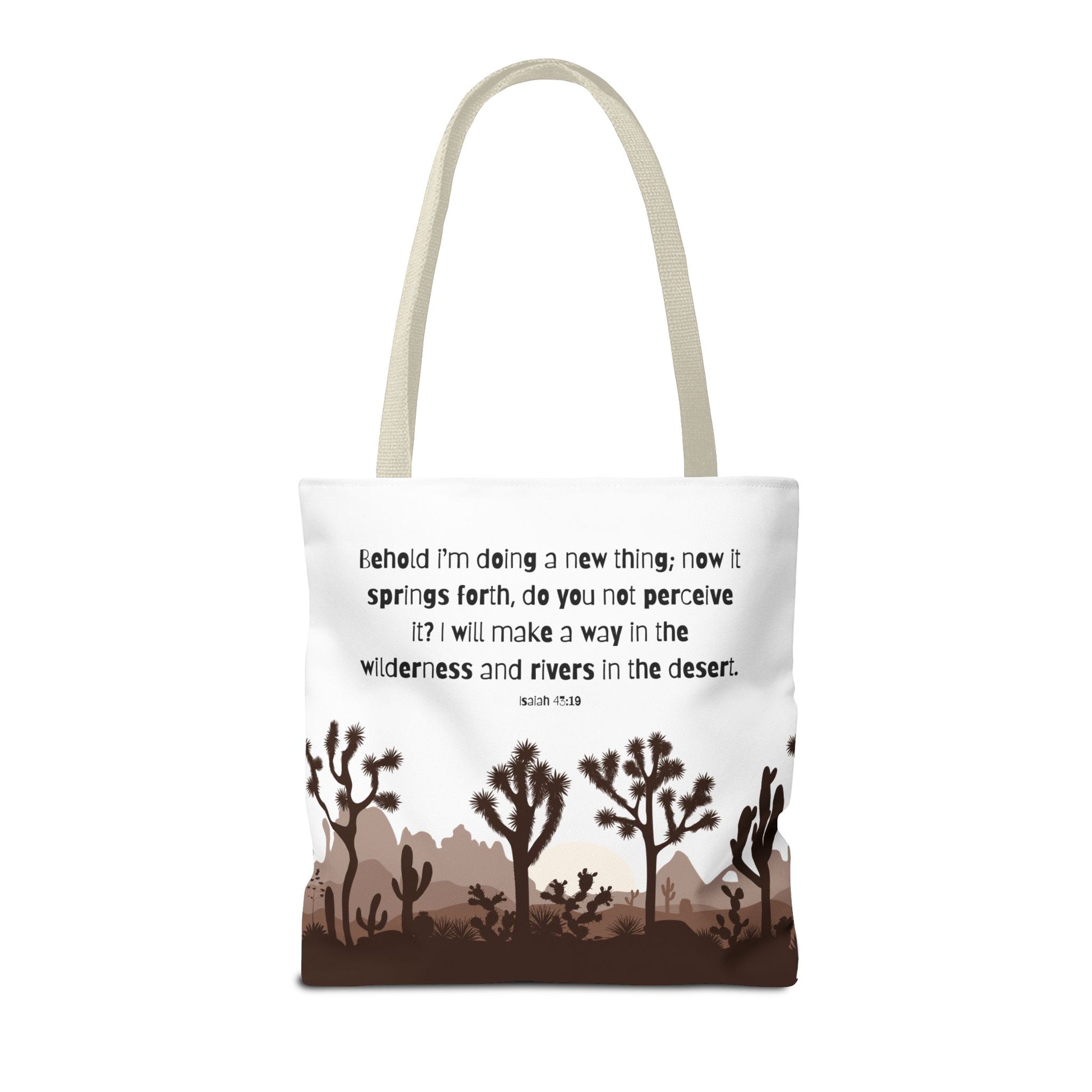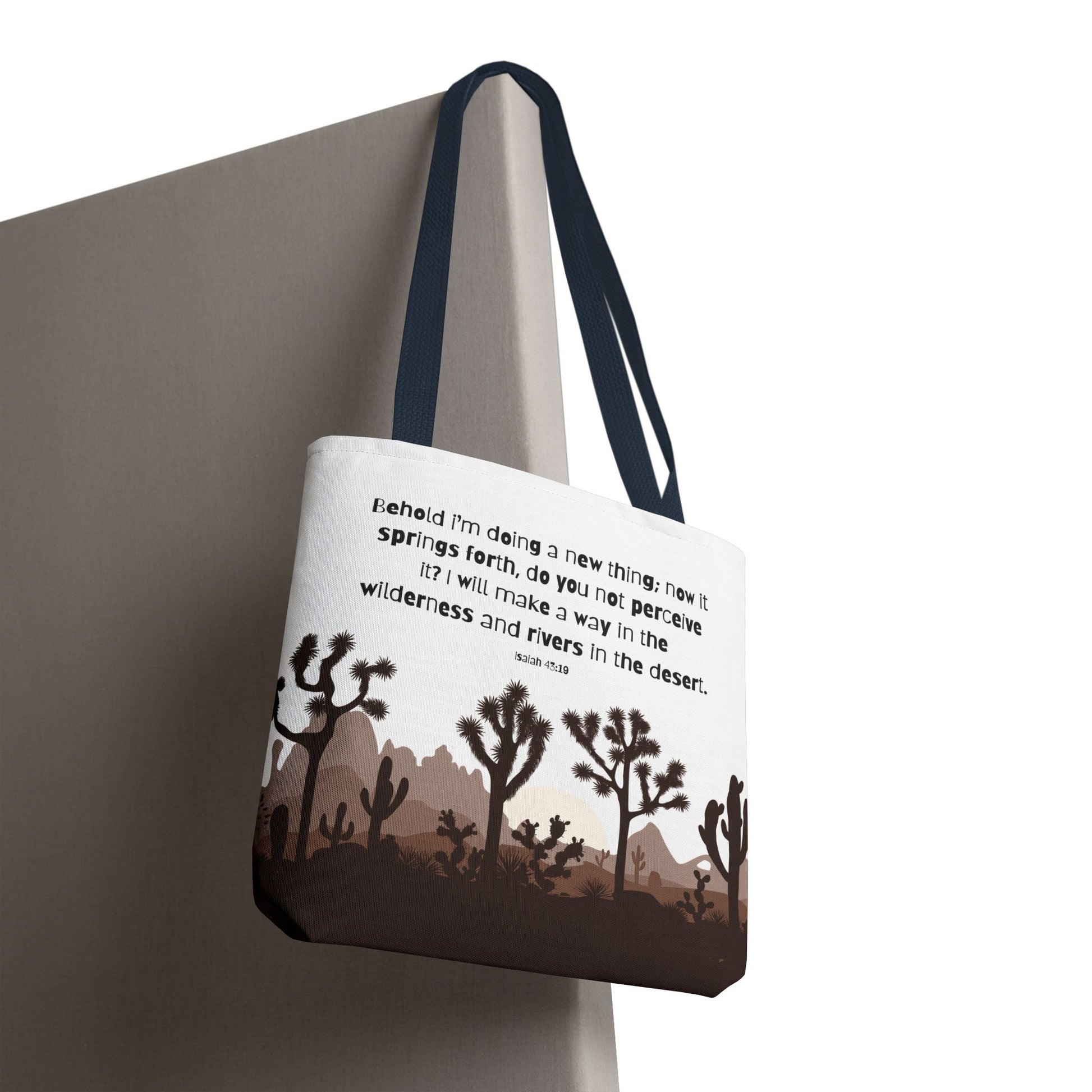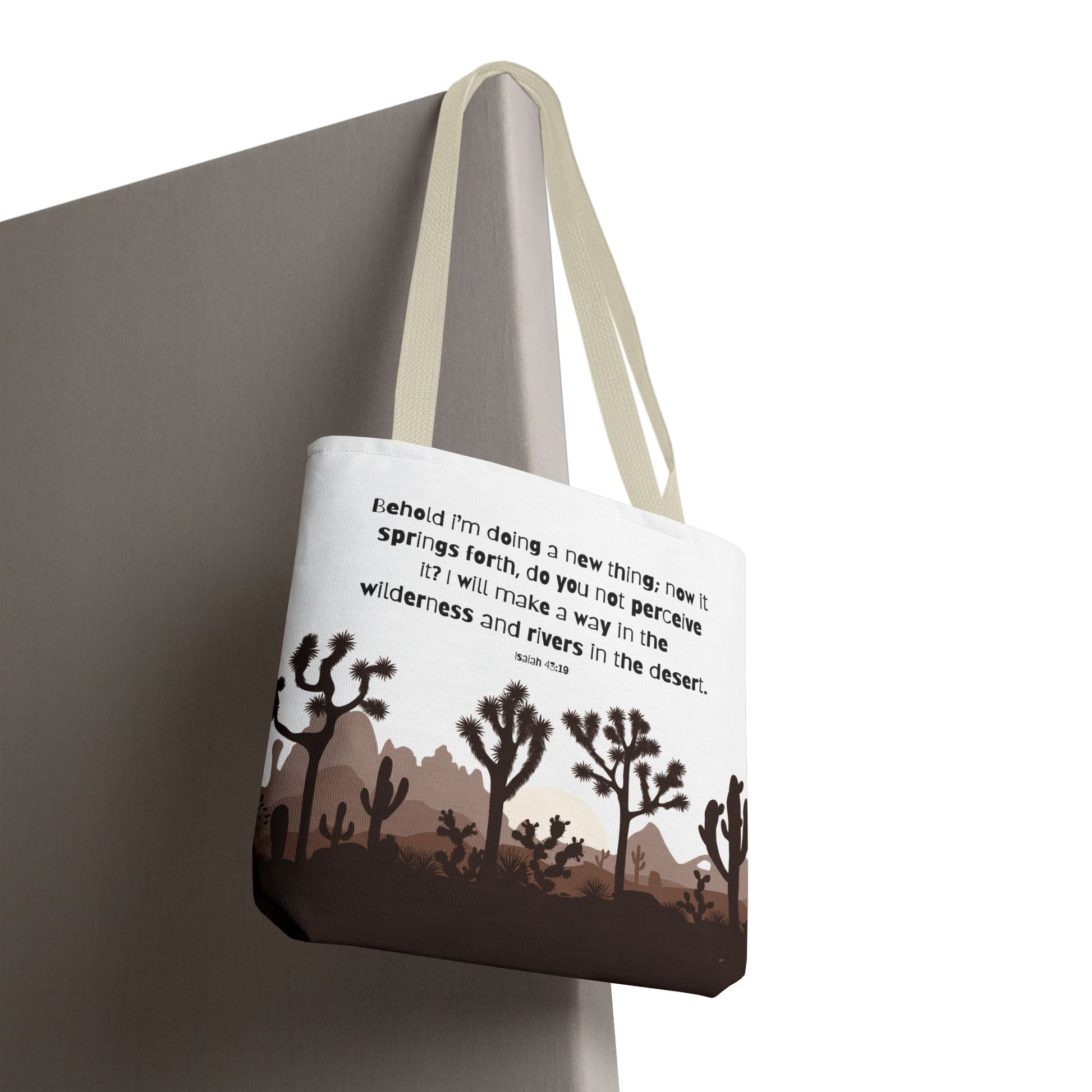 River in the Desert tote bag perfect for everyday use, made with durable 100% polyester fabric. This tote bag features reinforced stitching on handles, boxed corners for extra space, and comes in 5 color handle options. Ideal for those looking for a stylish and practical tote bag for carrying essentials, relevant for religious celebrations and everyday use.
