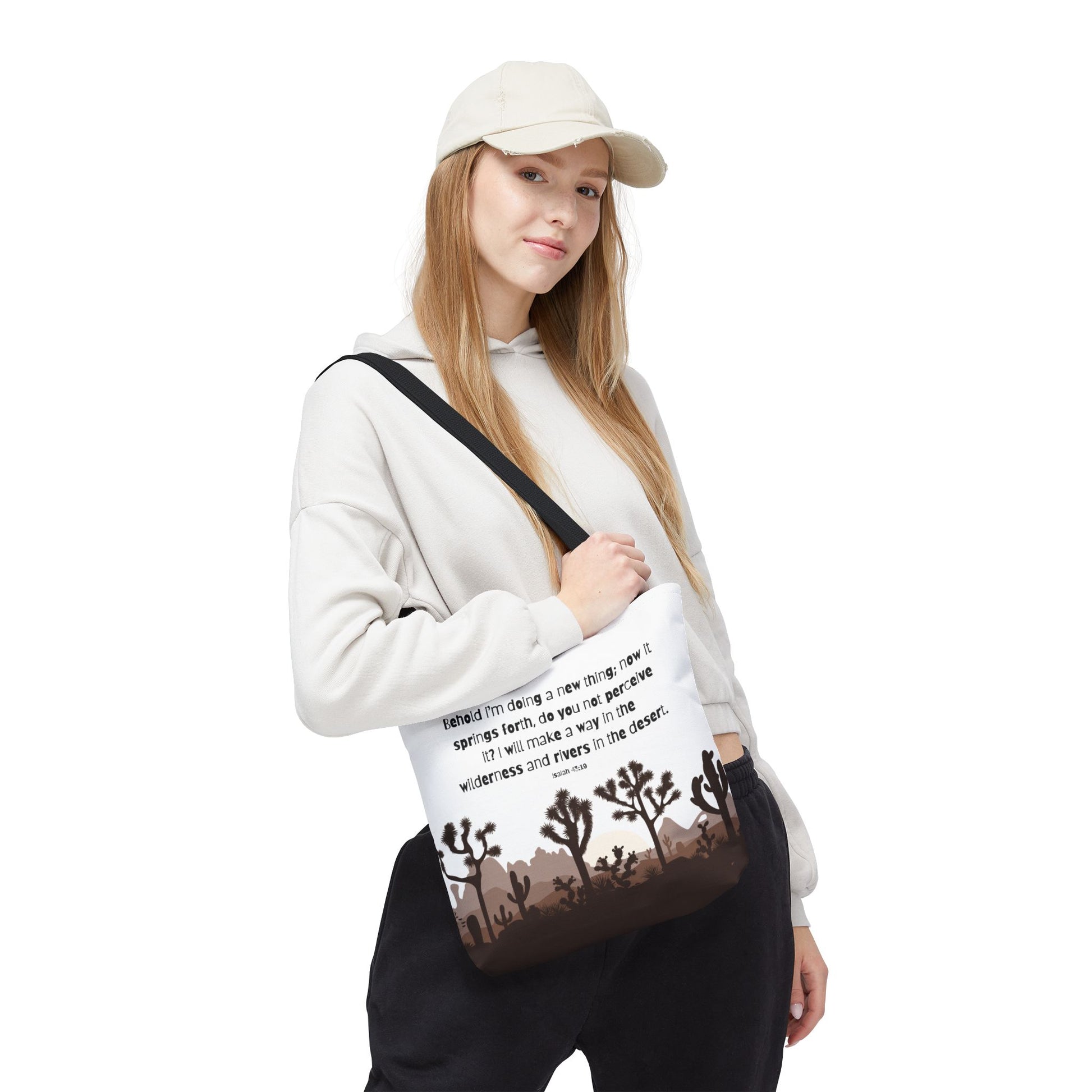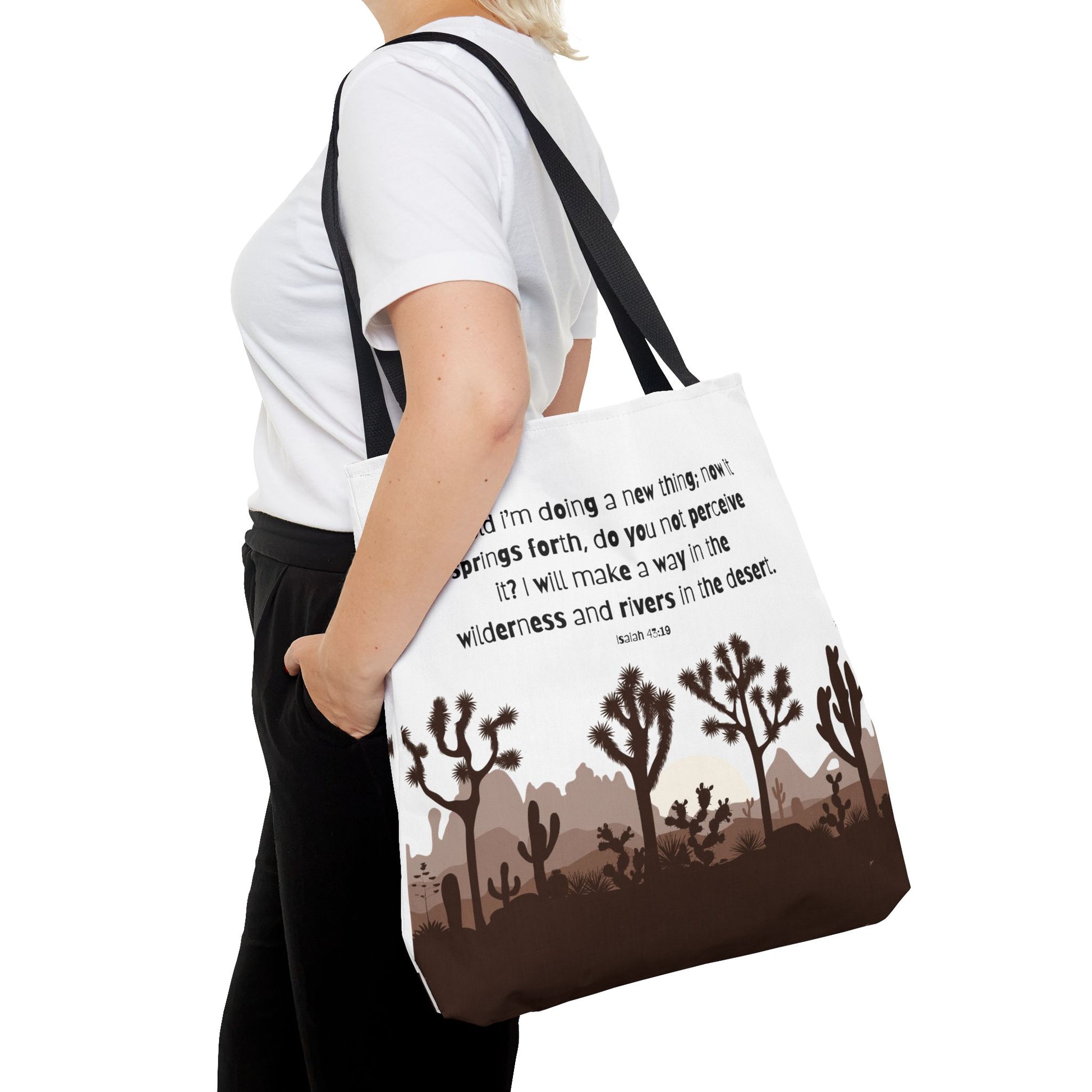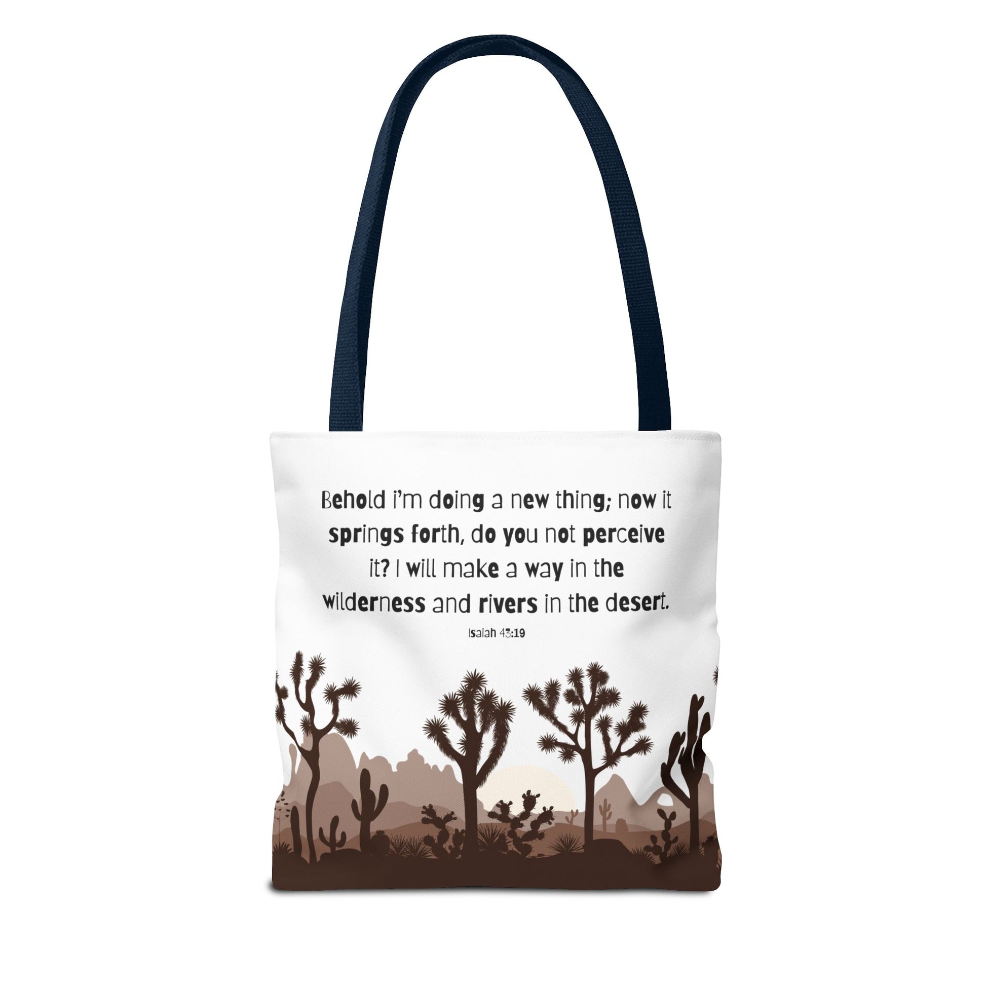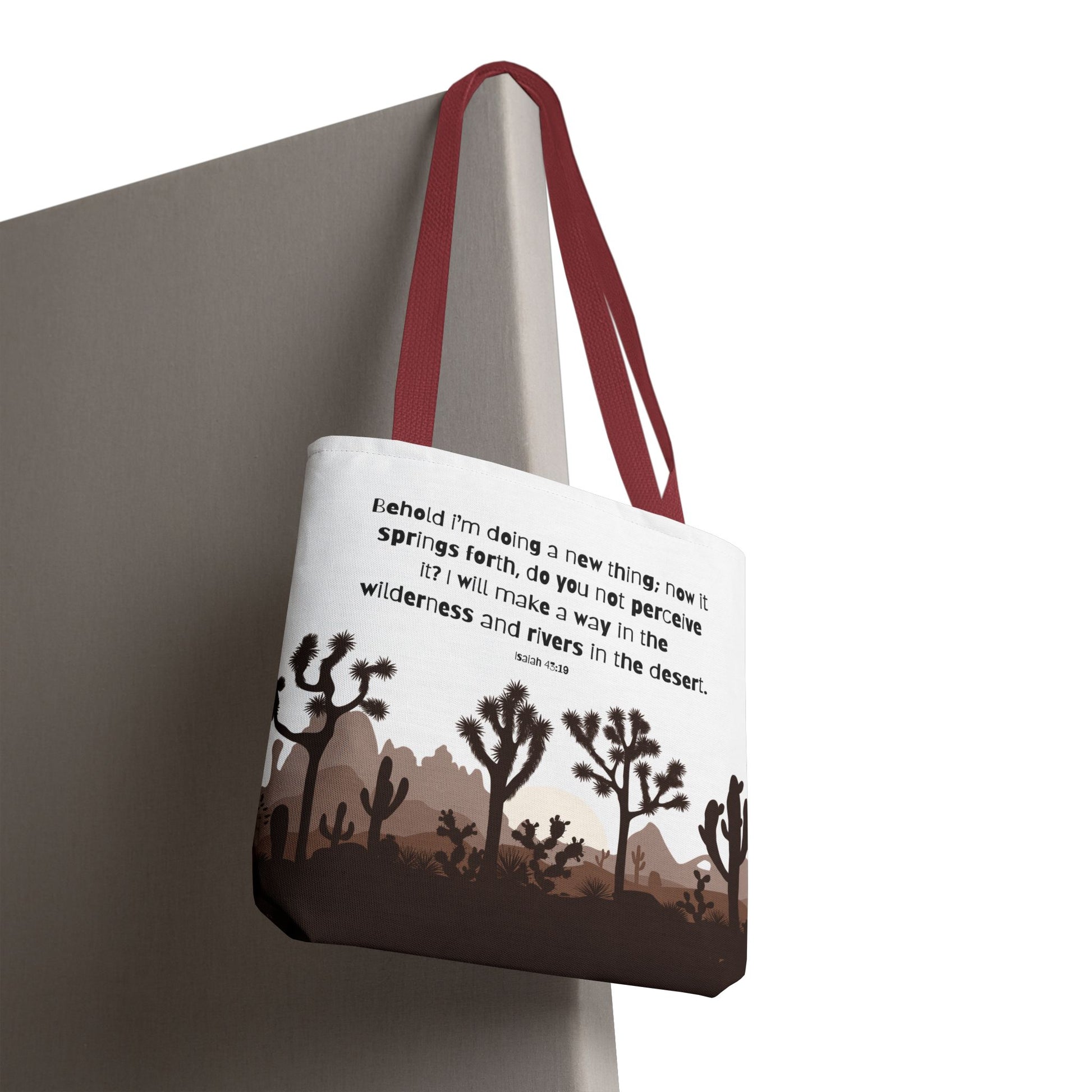 River in the Desert tote bag perfect for everyday use, made with durable 100% polyester fabric. This tote bag features reinforced stitching on handles, boxed corners for extra space, and comes in 5 color handle options. Ideal for those looking for a stylish and practical tote bag for carrying essentials, relevant for religious celebrations and everyday use.